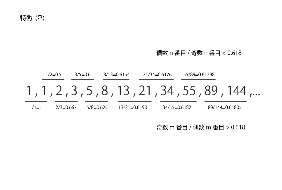 1つおきの数字どうしの比率は0.382に近づいていく。これも特徴2、3と同様に逆に割れば2.618に近づいていく。