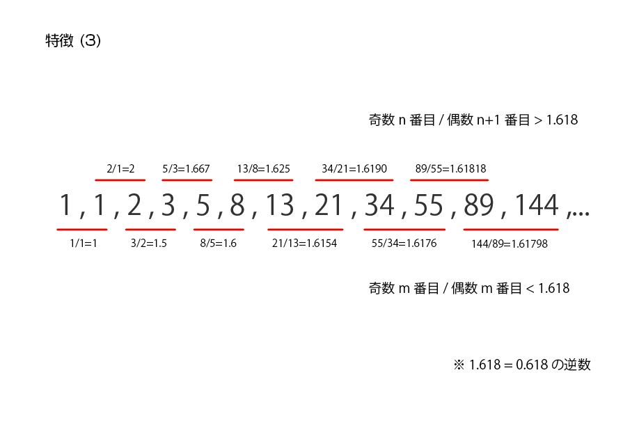 ある数の前の数に対する比率は数列が進むごとに1.618に近づいていく。これは先の特徴2の逆数です。割る数と割られる数を反対にしただけ。