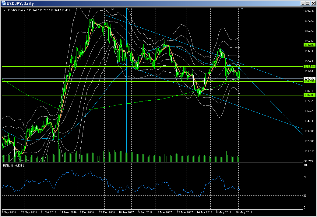 今年2月くらいからチャートポイントとして機能していた102円ちょうどくらいのラインを5月中旬に大陰線で下抜けたあといったんこのラインまで戻しましたが上抜けできずに再度下落してきたドル円。しばらくレンジ気味でしたが機能の雇用統計で一気にレンジ下端であろう110.5を日足レベルで下抜けました。