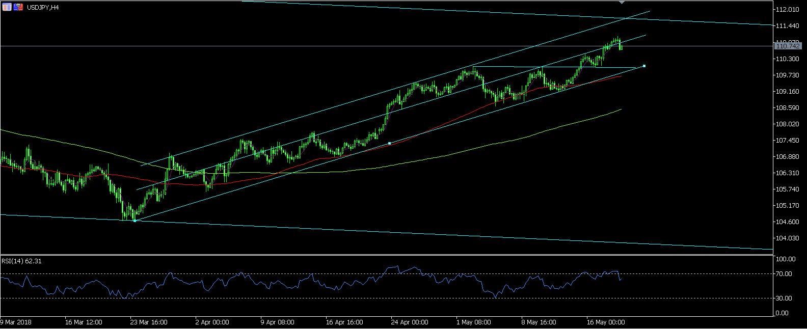 3回目の110円トライで超えた後いったんリターンムーブで110円まで下りてきてそこから上昇再開。割ときれいなかたち。ここ最近は本当にきれいなチャネルをひける。トレンドがはっきりでてます。週明けどうなるかはわからないけどしばらくはこれ続くんじゃないかなーって気がします。