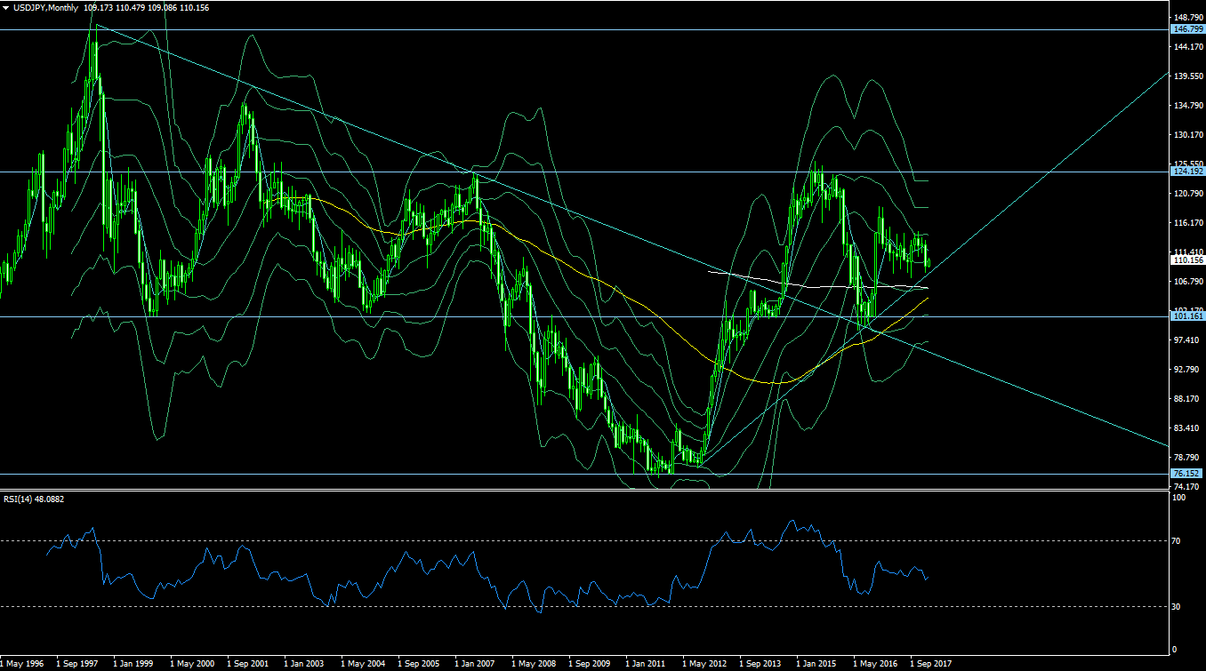 月足見ると下落トレンドのレジスタンスをトランプ大統領選挙で上抜けたあとのリターンムーブでサポレジ転換したのを確認したかたちにみえる。2012年からのサポートがまもられたら上昇再開するようなかたち。ラインはひいてないけれど2015年からのレジスタンスをひけば三角持ち合いですね。要はレンジ。今年は個人的にはドル売りの年かなーと思っています。長期的にみると75円くらいからの上昇トレンドとも見れます。