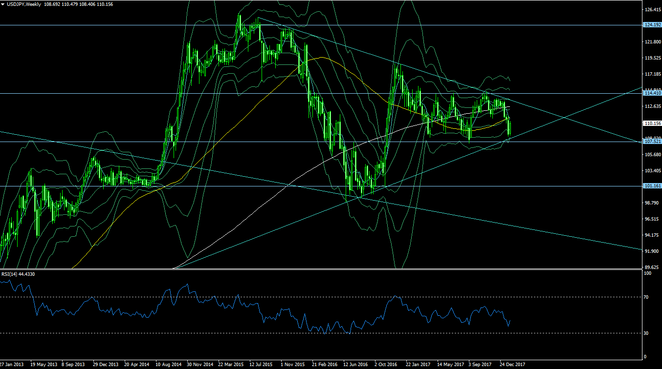 週足でみると去年のレンジが継続しているかたち。ただ去年の最初と比べると上をせめてみてこえられずに力尽きてきたかなーって感じのチャートにも見える。注目は107円〜108円のところを下に抜けるか125円からのレジスタンスをぬけて114円中頃をぬけてこられるかを見極めたいところ。